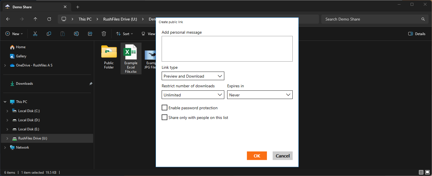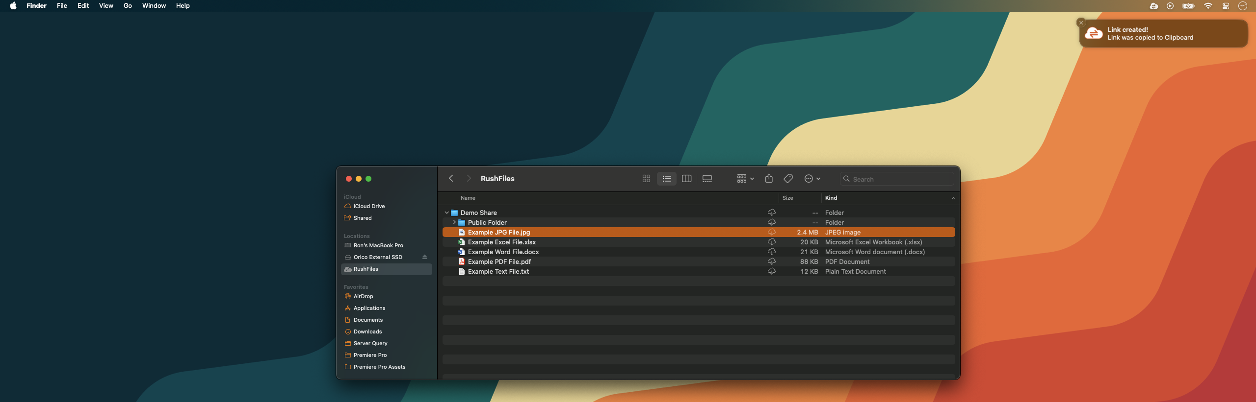 - Click RushFiles and select Create link in clipboard or Send link in email