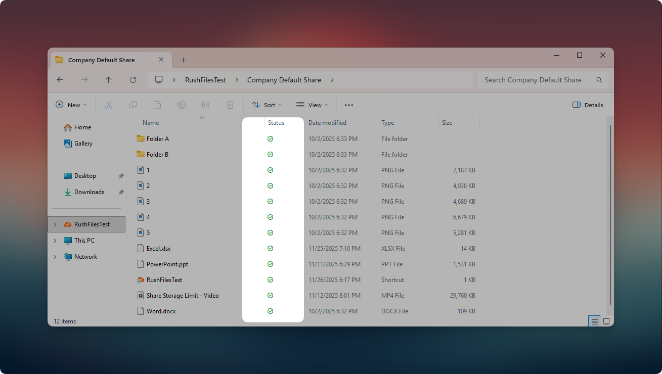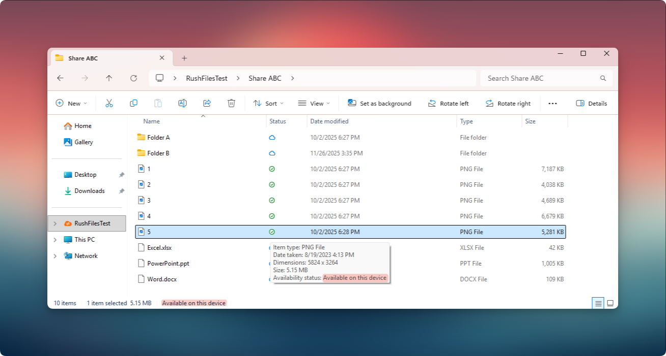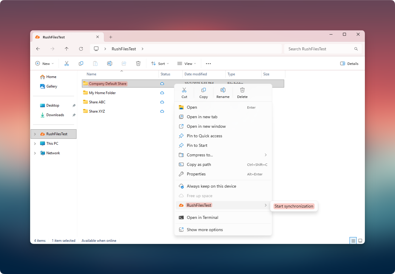 From the RushFiles menu, selecting Download initiates an immediate download of the selected file or folder contents. After downloading, the file is cached locally and can be accessed offline.
