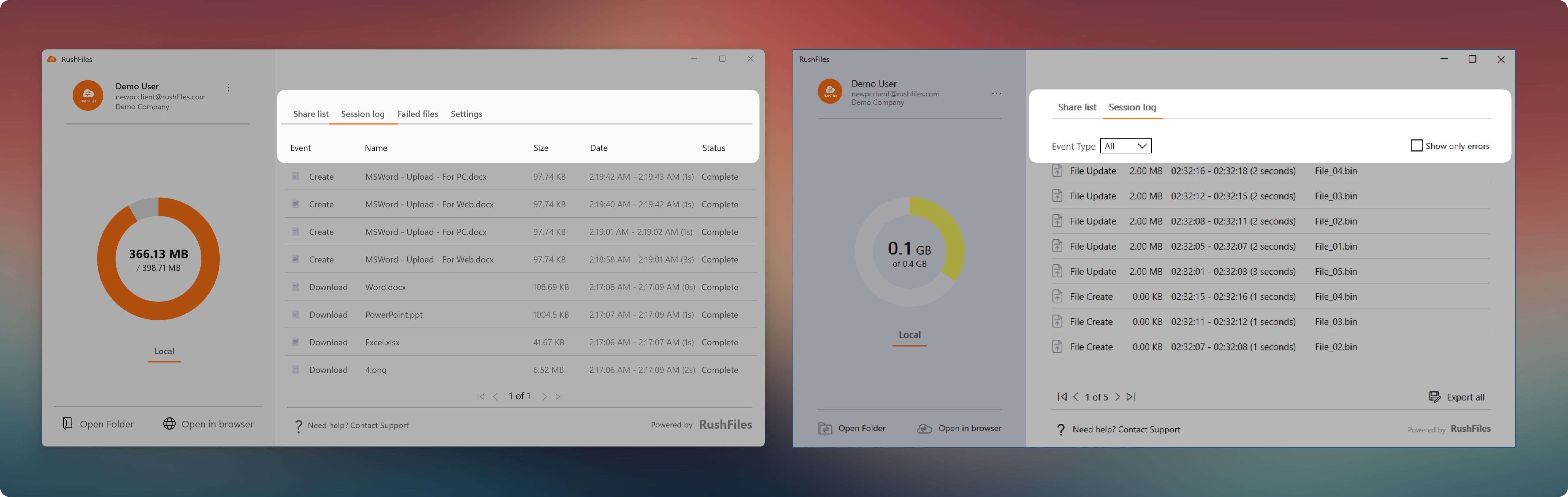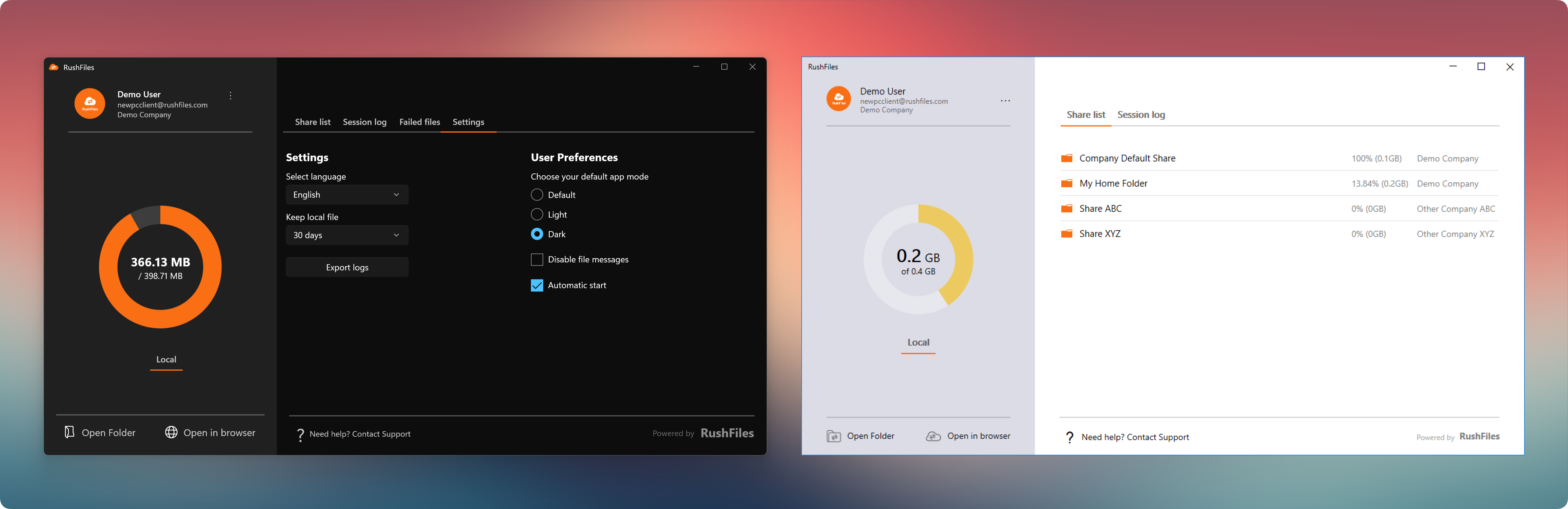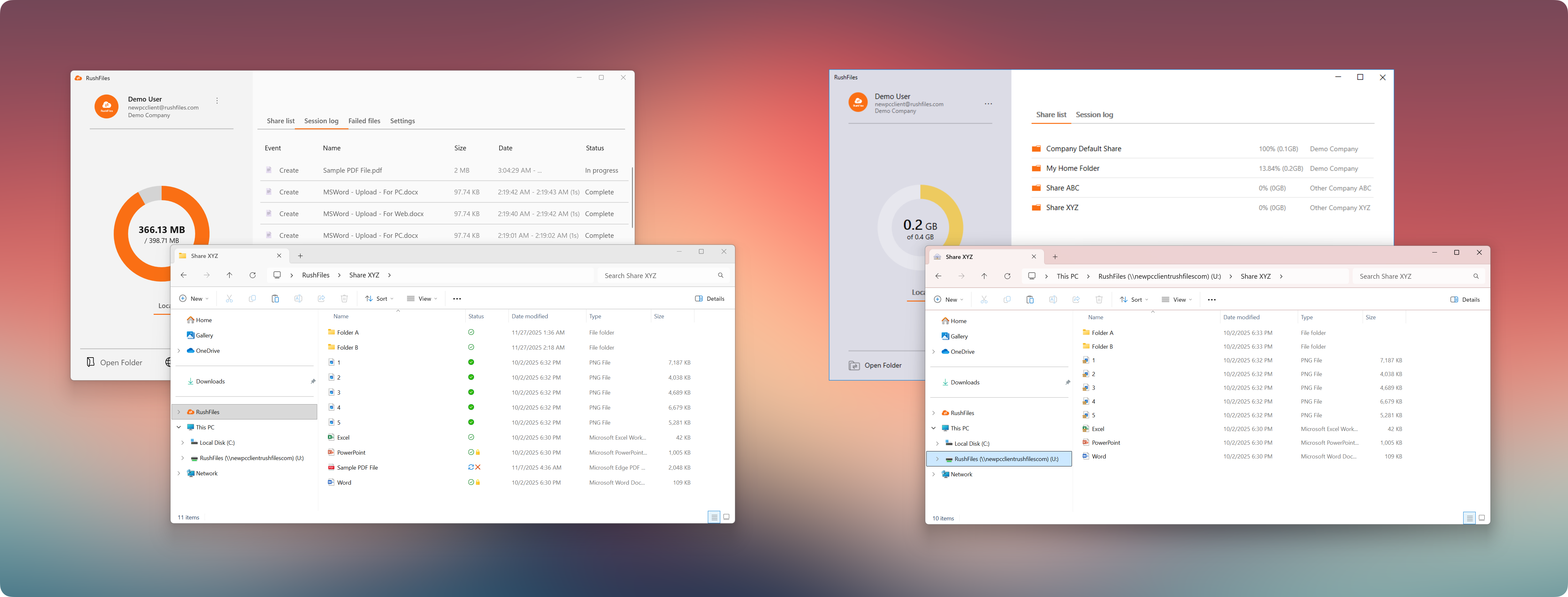 The RushFiles Windows App is a redesigned native desktop application that gives users direct access to their files and shares from a Windows computer. Built with performance and stability in mind, this new client offers a smoother, faster, and more intuitive experience compared to its predecessor, the PC Client.