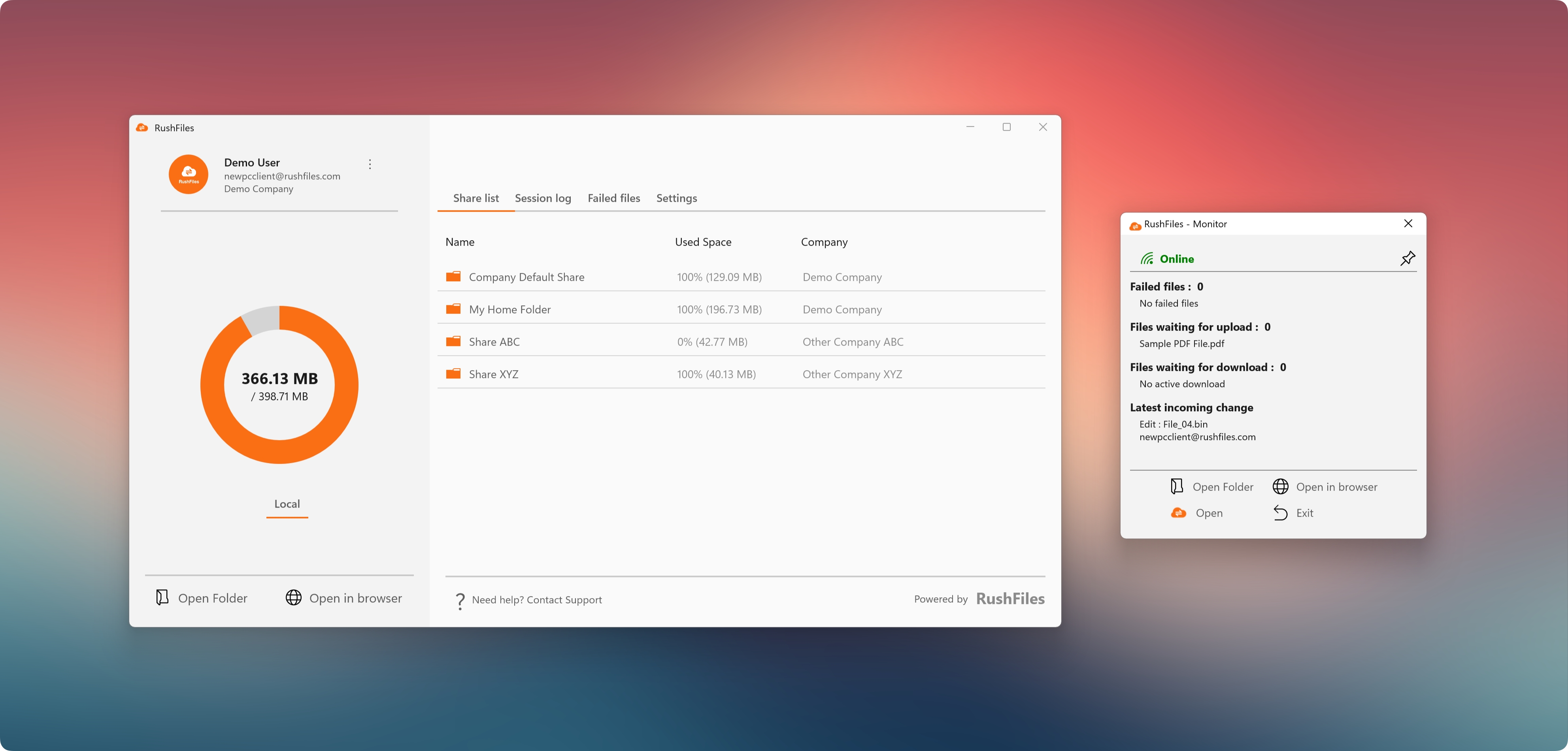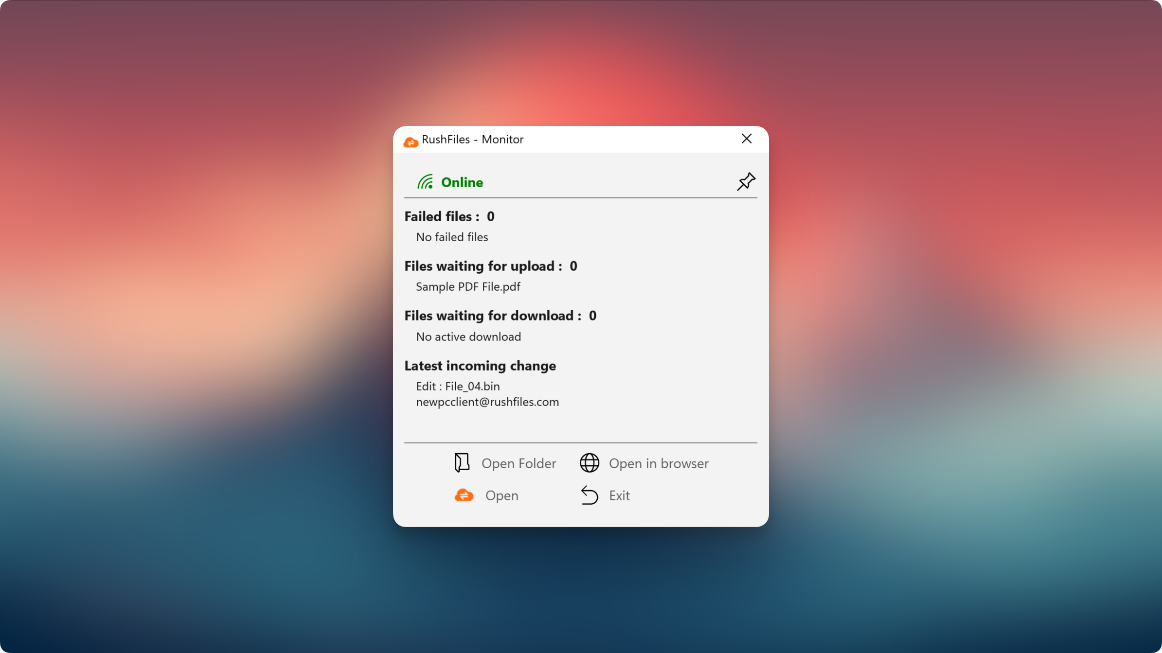 The RushFiles Monitor Area is a compact companion window included with the Windows app, designed to give users a clear, real-time snapshot of synchronization activity. It highlights failed files, pending uploads and downloads, and the latest incoming changes. This helps users understand the synchronization state at a glance, without having to go through the Session log.