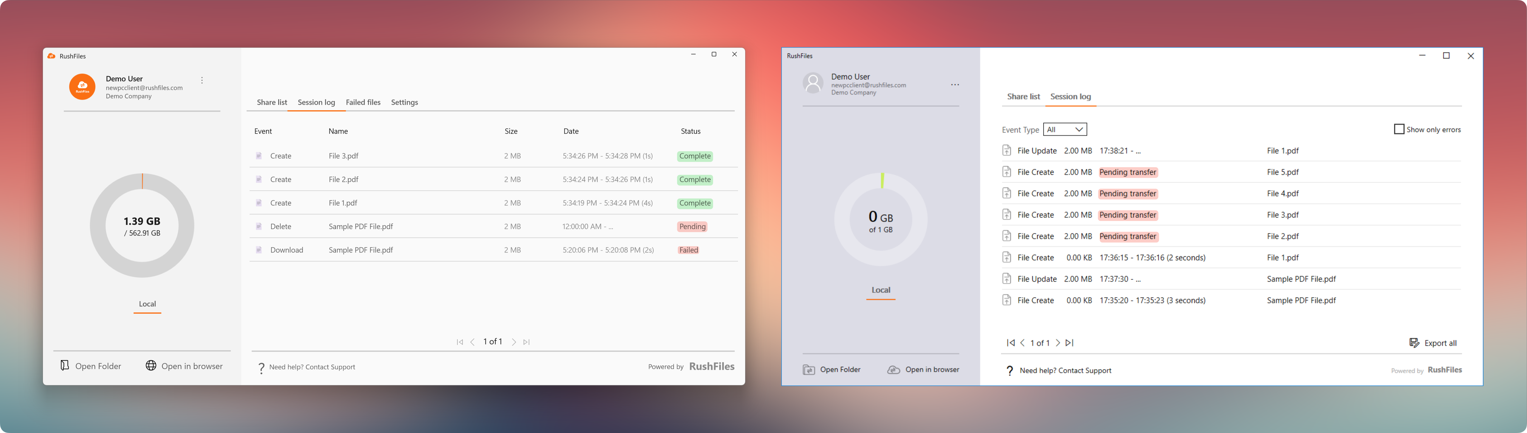 The Windows App (left) uses a new, Windows-native sync engine that supports displaying file hydration states directly within the RushFiles folder. This allows us to display more accurate information about the sync state of each file, using indicators that users are familiar with.
