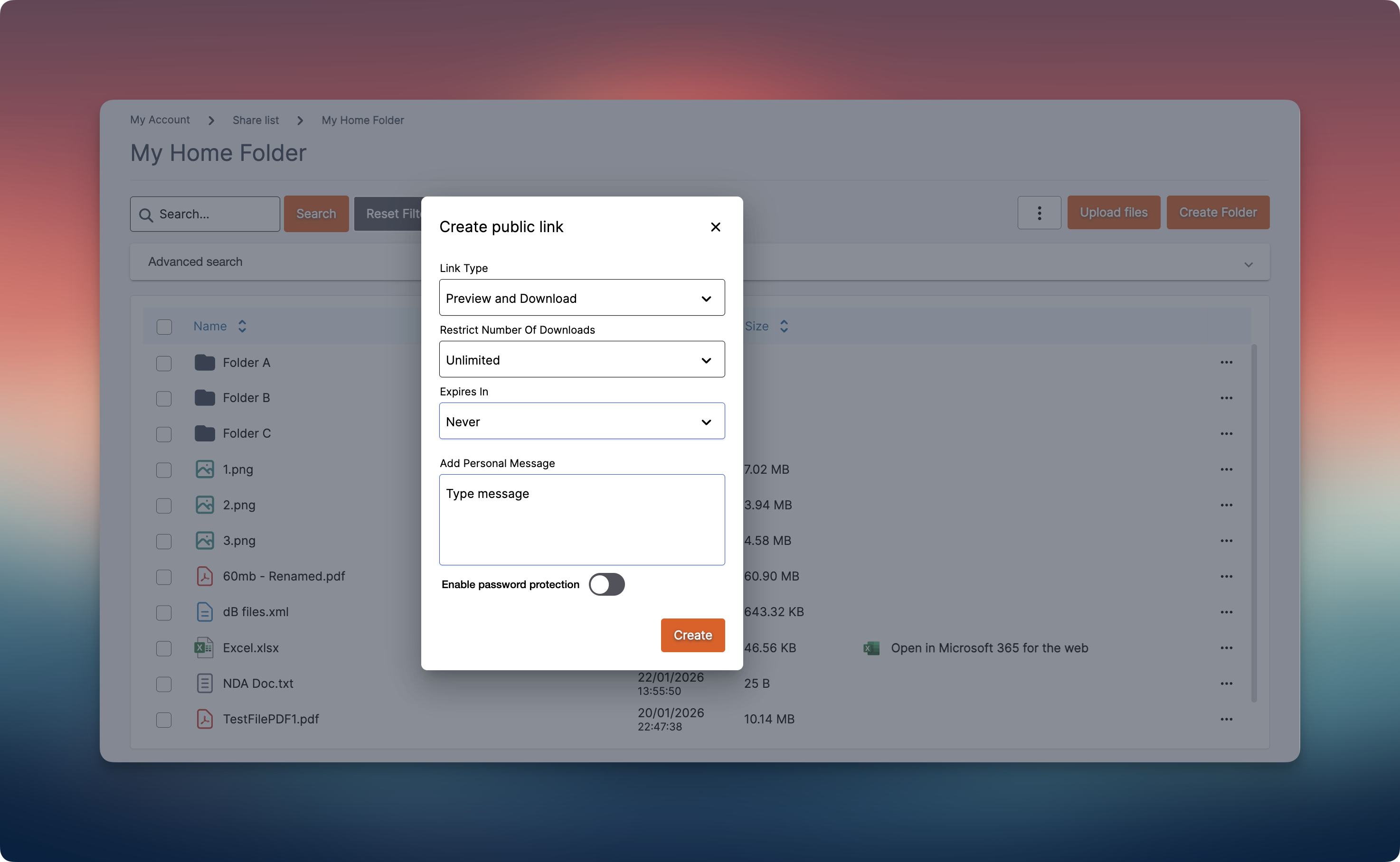 Public links allow files or folders to be shared externally without requiring a RushFiles account. These are commonly used for one-time or external file sharing.