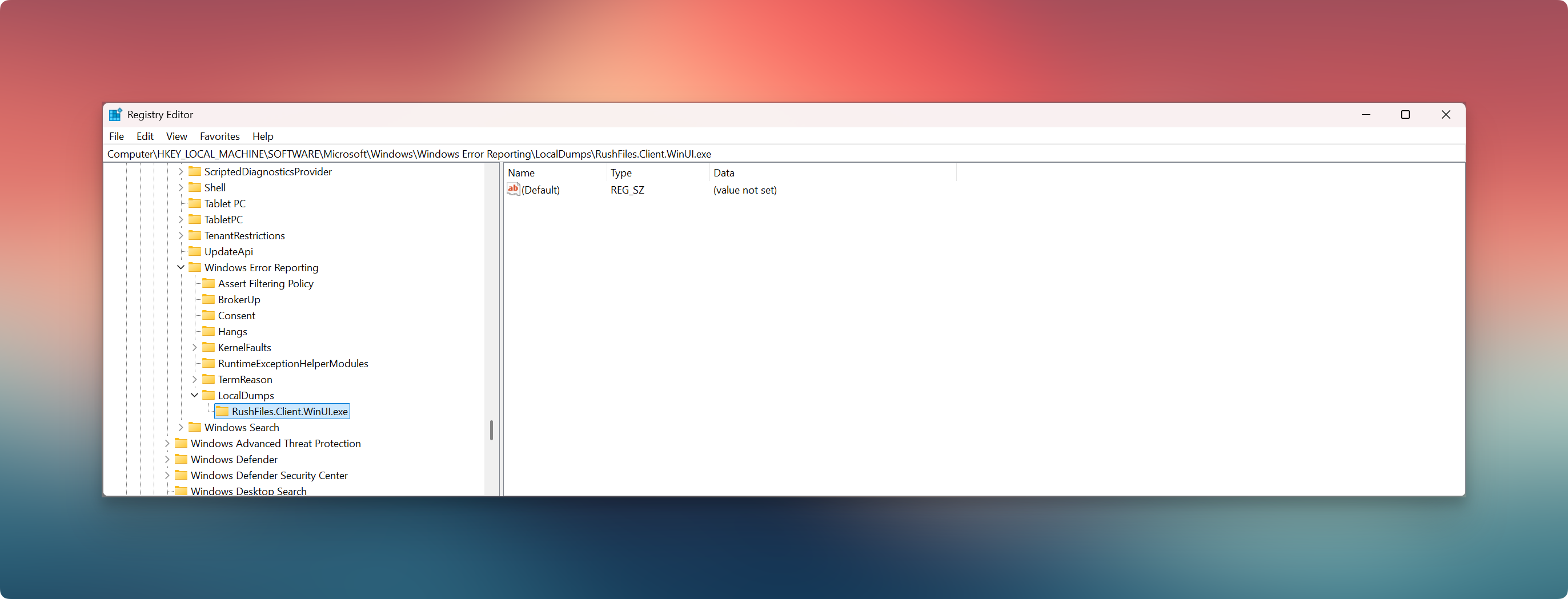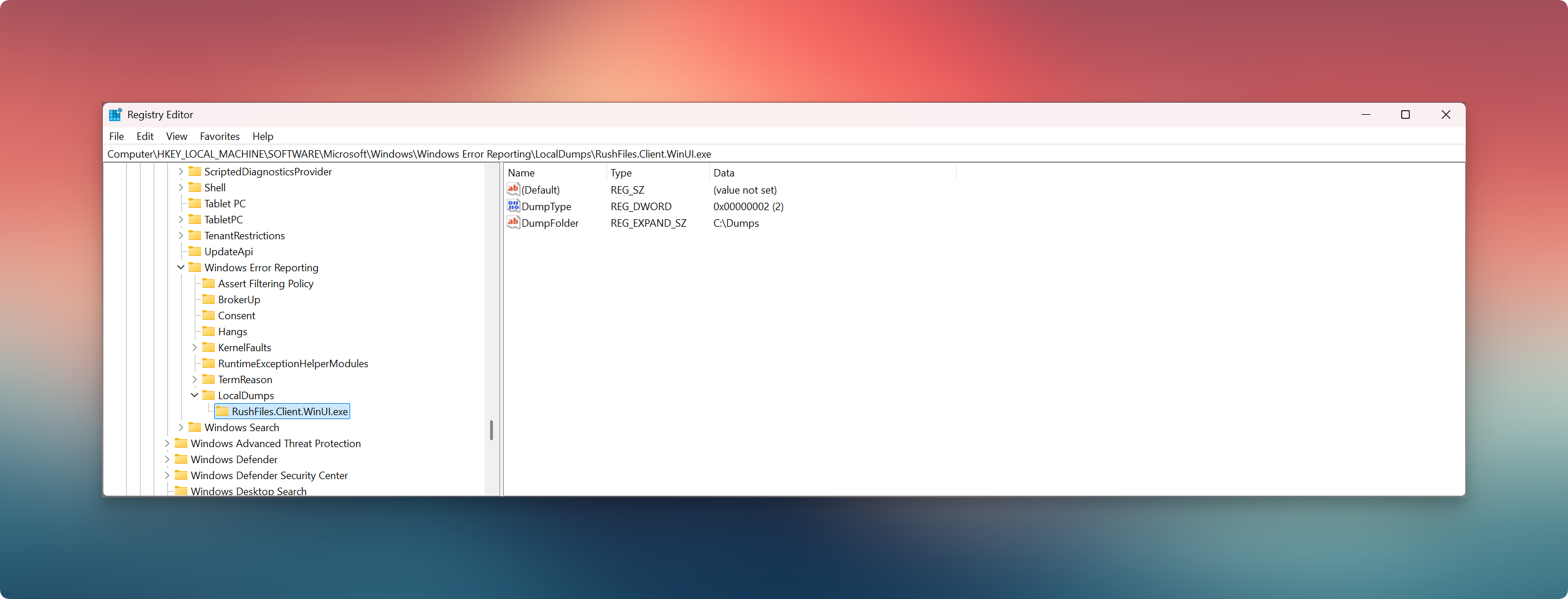 HKEY_LOCAL_MACHINE\SOFTWARE\Microsoft\Windows\Windows Error Reporting\LocalDumps\RushFiles.Client.WinUI.exe